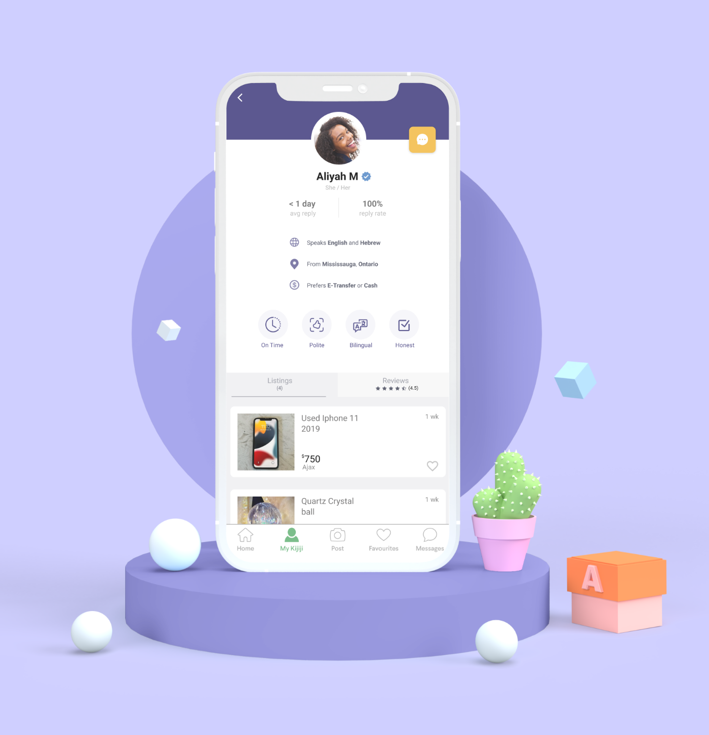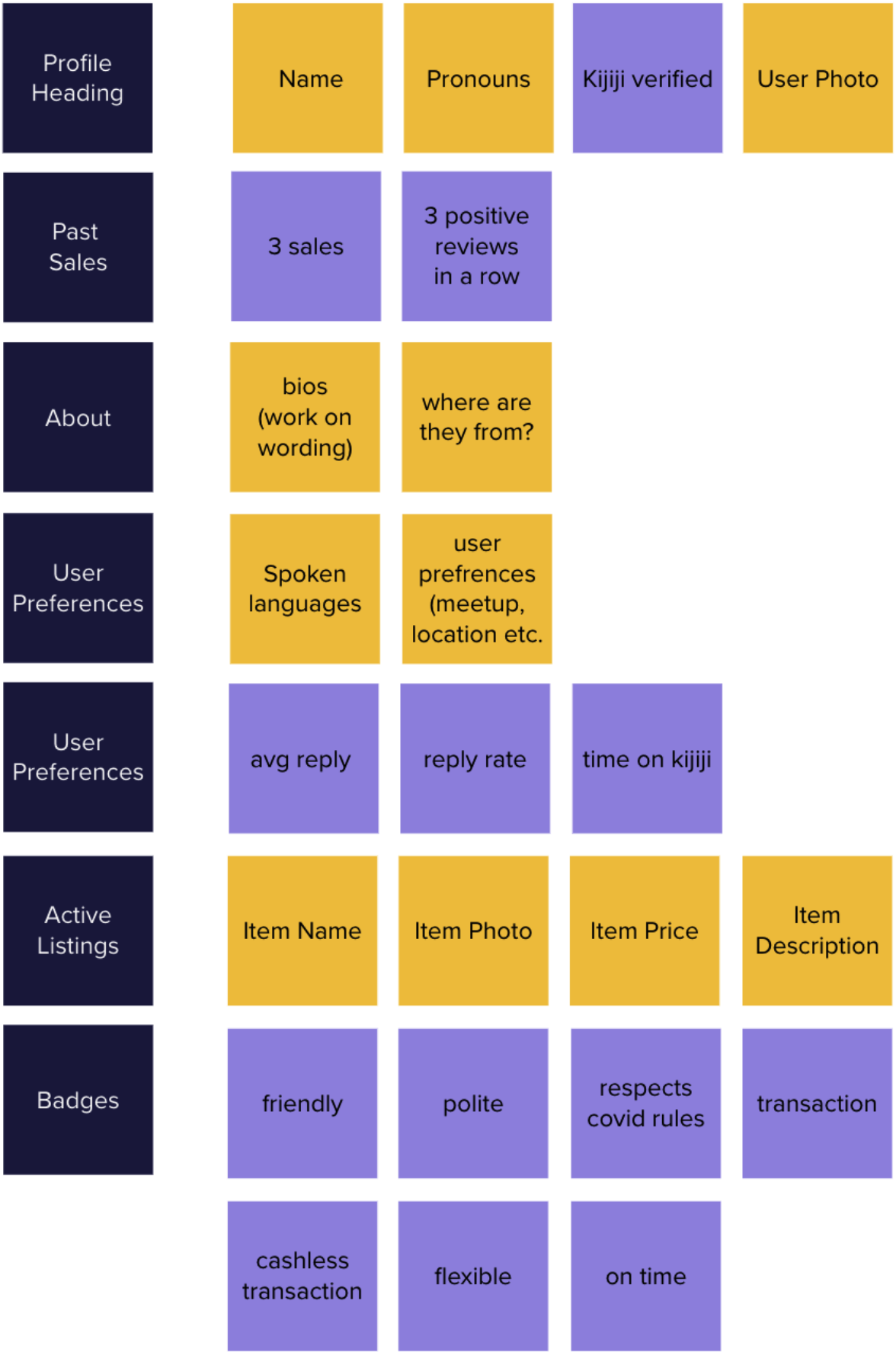 One of the main features new decided to change was the Kijiji profile. We found that users valued the ability to get to know who they were going to be meeting up with. The following is a rough hierarchy of information that would appear on the new profile page.