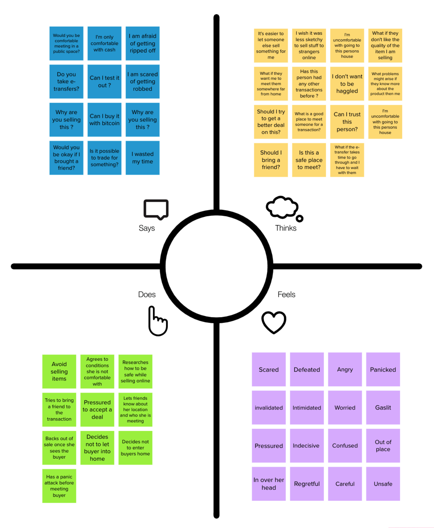 Using Mural, we created an empathy map to help us understand what users might be feeling when using an online marketplace. This exercise helped us to keep our focus on the user by putting ourself in their shoes.