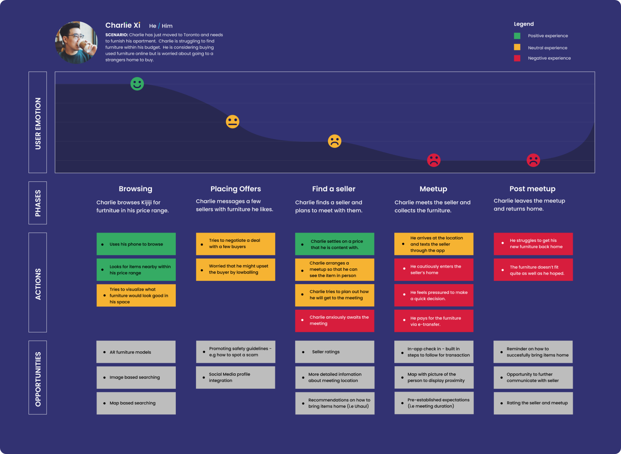 We created two personas that we felt accurately modelled the needs and pain points that real people were experiencing. Using our empathy map and these personas we were able to create companion user journey boards. These helped us to visualize that the biggest pain point our users faced came from preparing and attending the in person meetup.