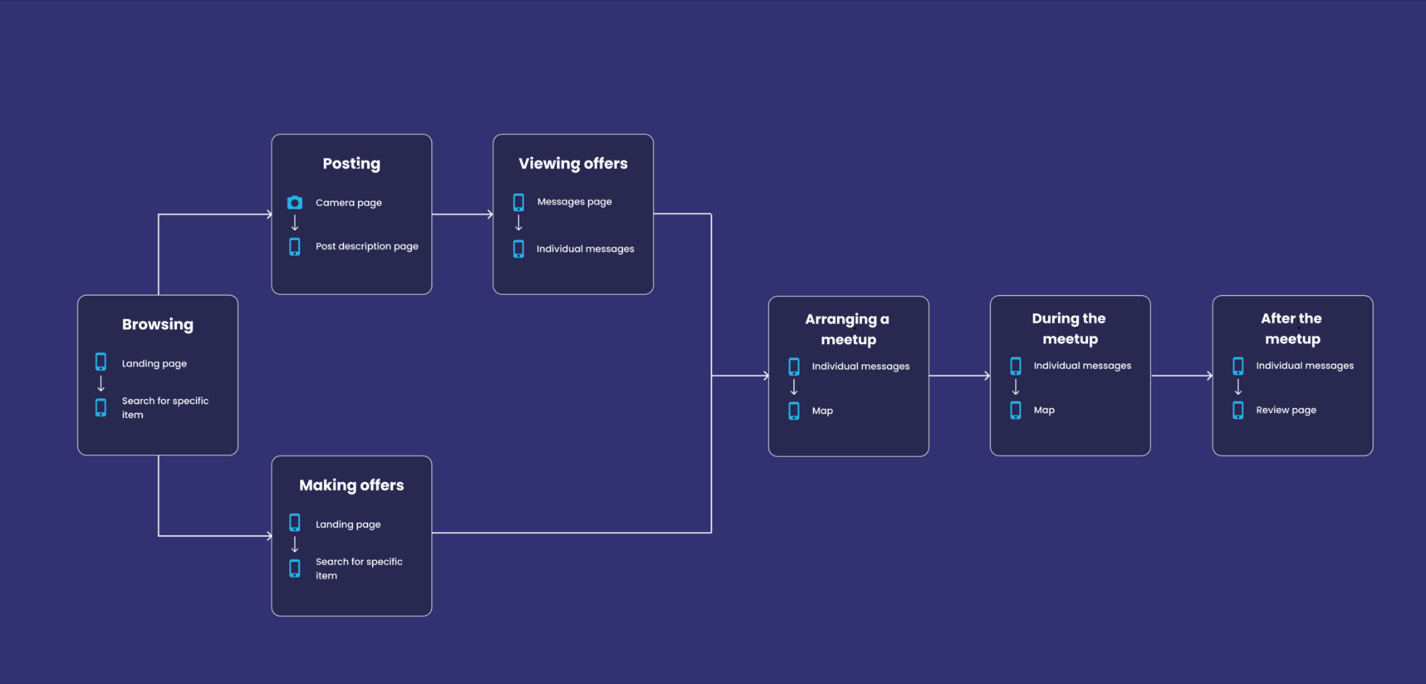 Using the list of interactions as a rough guide to how our system might operate, we then created a more defined system map that we could follow. Creating the system map helped to kickoff to our prototype phase and would guide us in finding what features and screens needed designing.