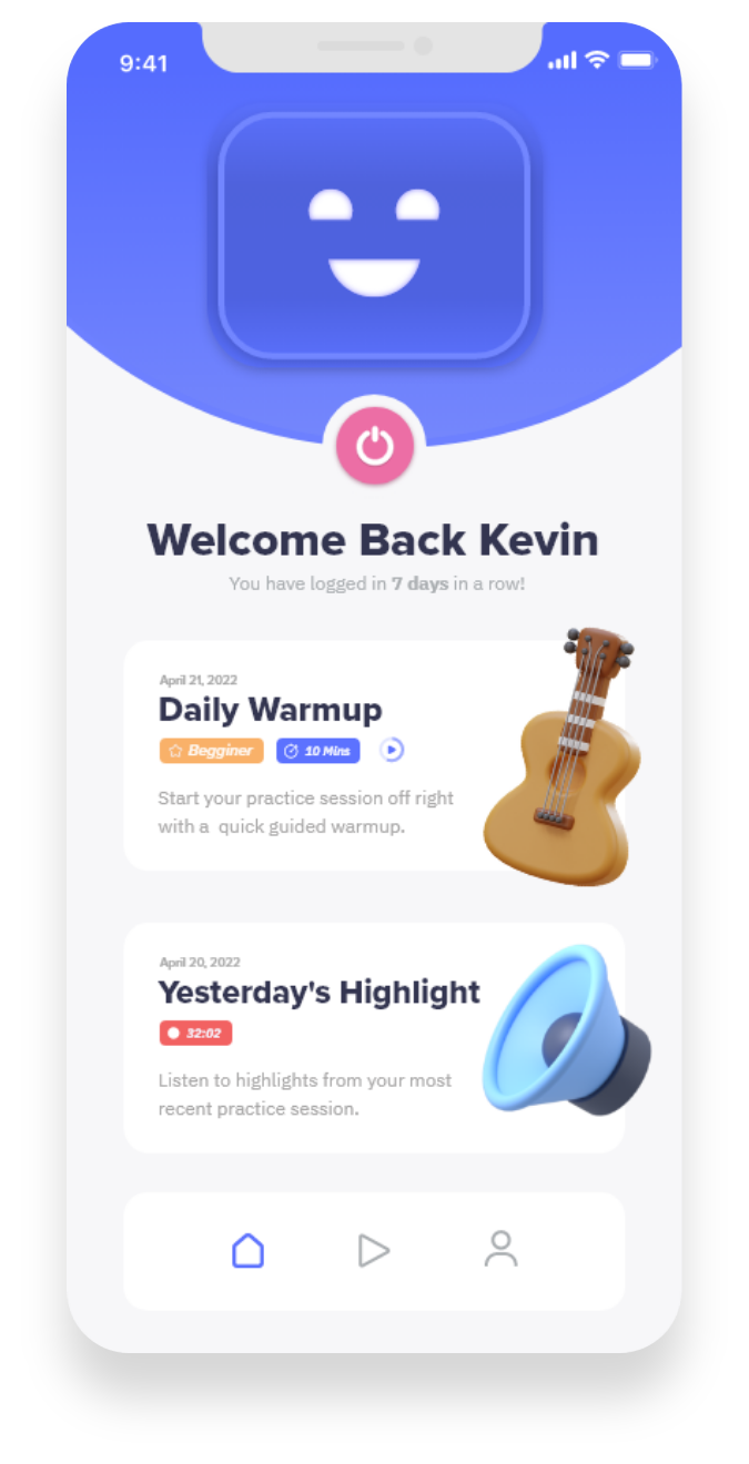 Rather than designing a whole a new interface and control system for the product, I decided that I would make a companion app that would function as a controller and diary for users to monitor their progress. I opted for this because I didn’t want to overwhelm users with having to learn a whole new control system in order to use Practice Bud-E. By creating a mobile companion app, control and use would be more familiar to users.